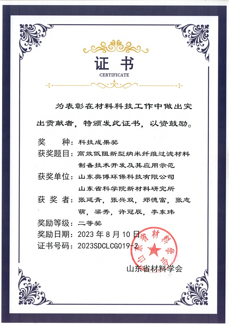 大會舉行的山東省材料科技成果頒獎儀式,由山東奧博環保科技有限公司與山東省科學院新材料研究所,共同研發的“高效低阻新型納米纖維過濾材料制備技術開發及其應用示范”項目,以其優秀的產品性能,廣泛的應用領域及社會經濟效益,榮獲二等獎!